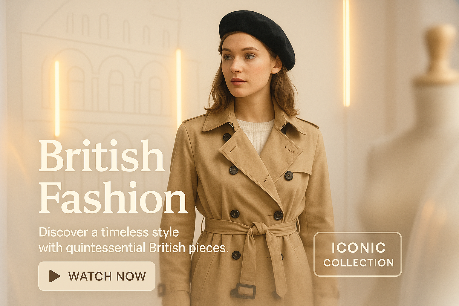Stylish promotional banner showcasing British fashion with elegant design elements, ideal for e-commerce marketing and fashion retail.