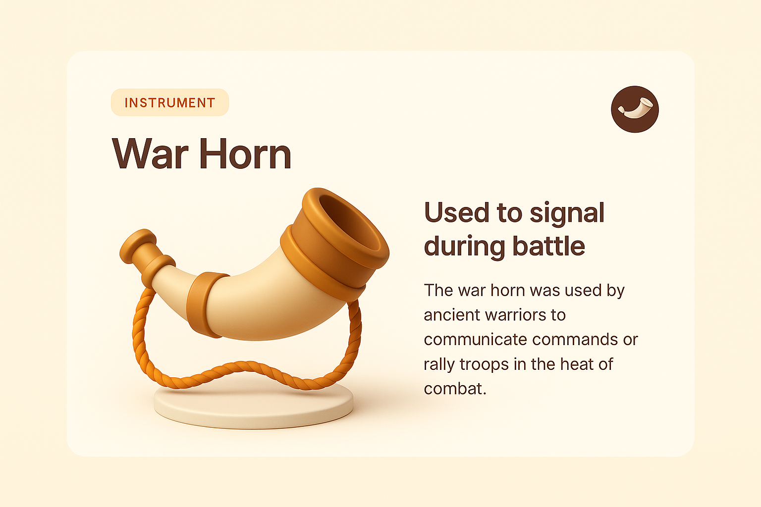 A 3D illustration of a war horn, designed to signify its historical use in battle. The light background enhances the visual appeal, featuring smooth gradients and supporting text.