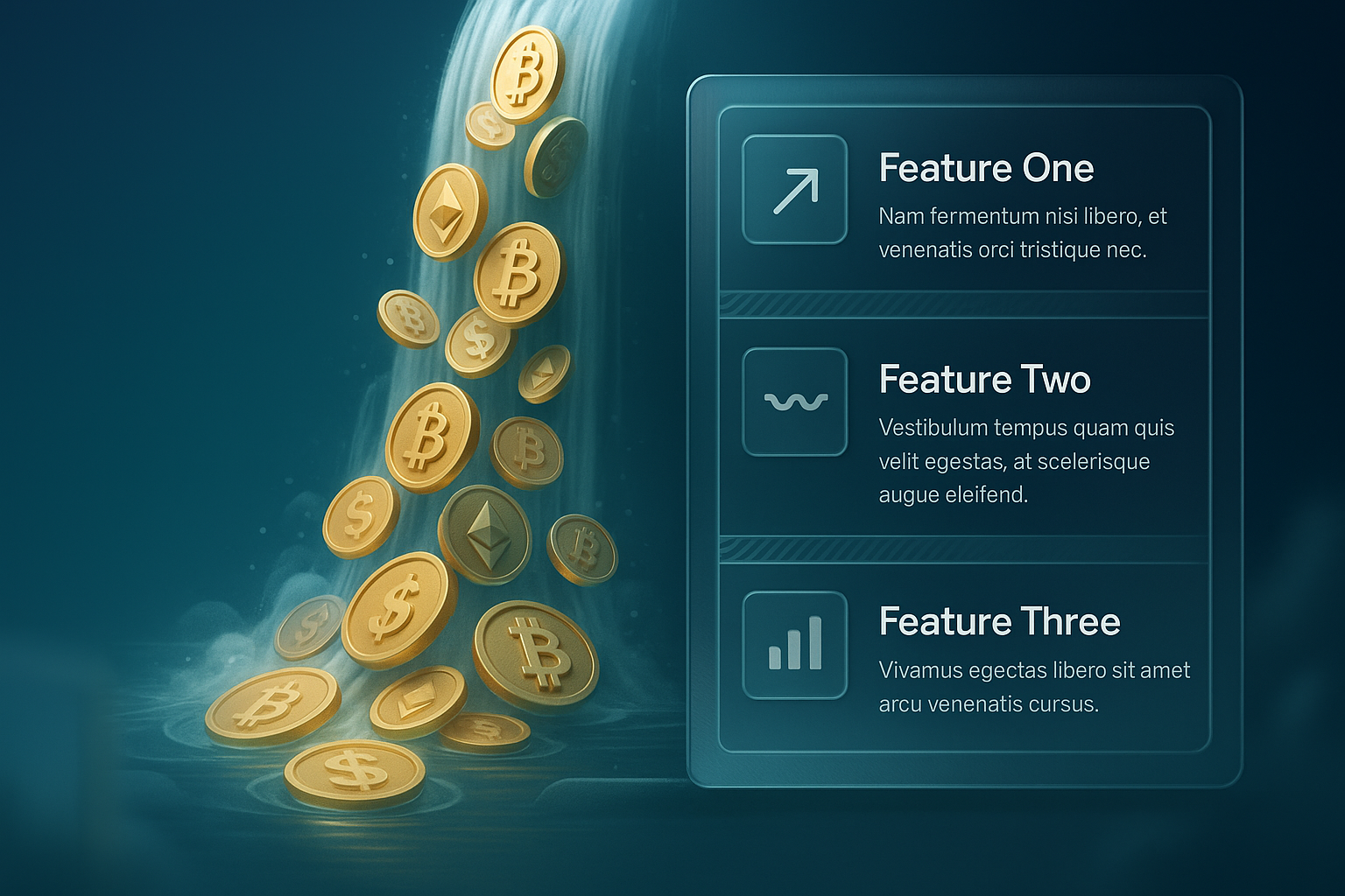 /Collection: /by davooda/Type: PNG/A captivating 3D illustration of a waterfall made of gold crypto coins, complemented by feature blocks detailing key attributes. The design incorporates a smooth gradient background and layered elements for depth.