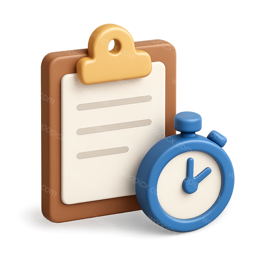 A visually appealing 3D icon featuring a clipboard with a notepad and a stopwatch, designed in an isometric view with a transparent background.