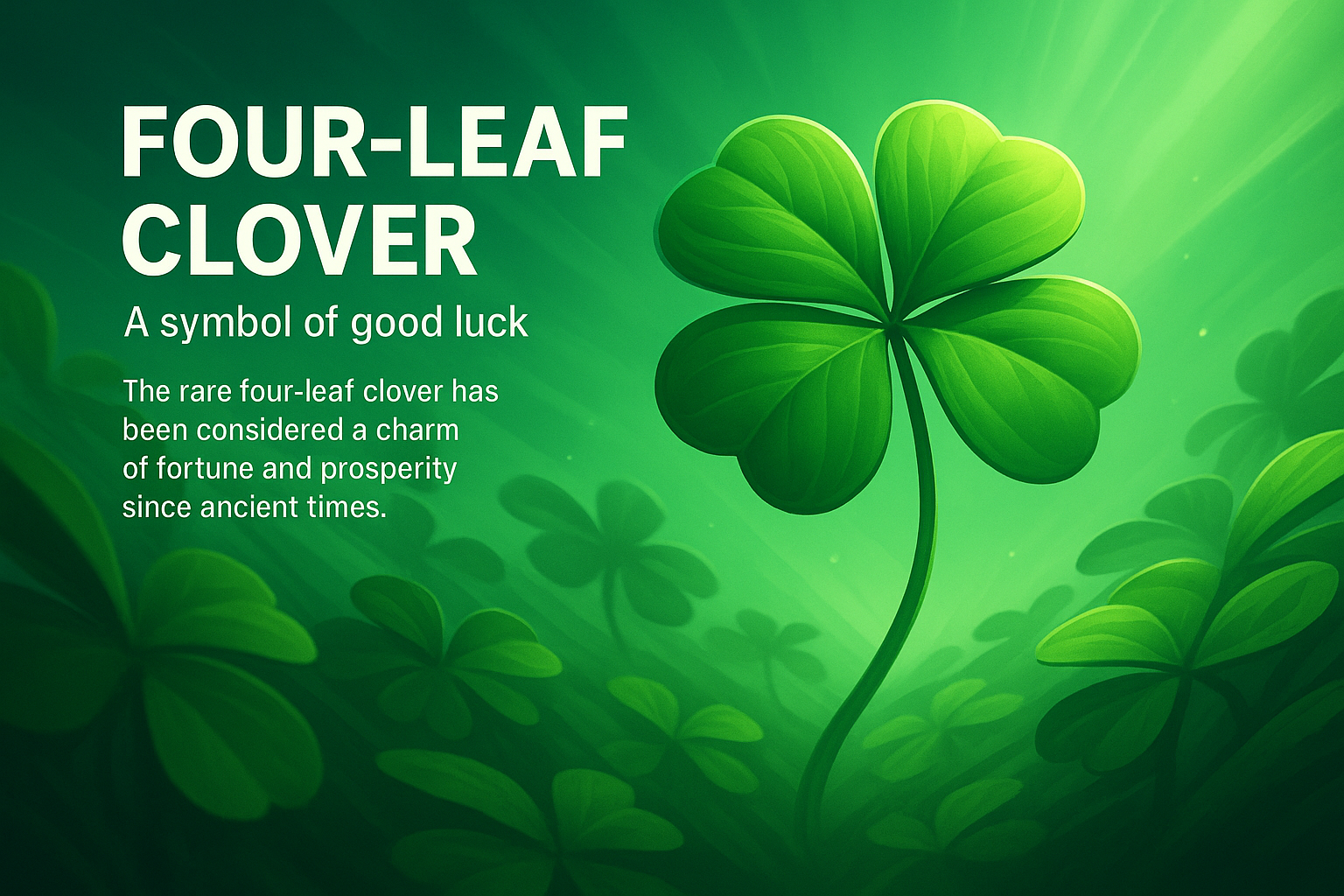 A vibrant illustration of a four-leaf clover set against a lush green gradient background, symbolizing good fortune and prosperity. The design features a dynamic composition with layered elements.