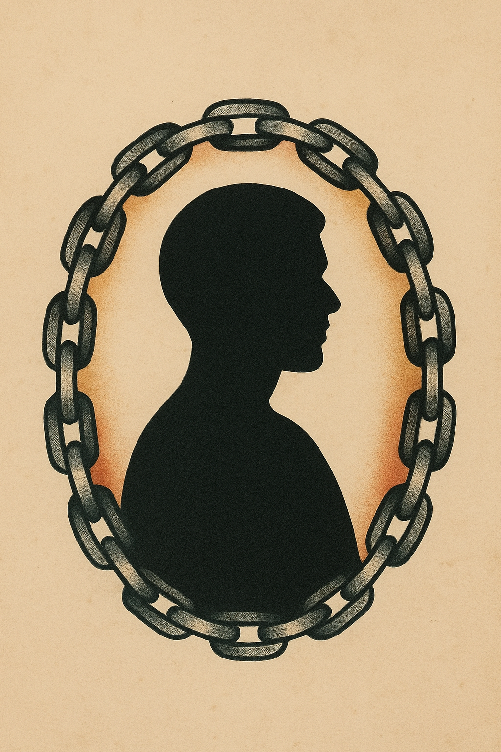 A striking tattoo design featuring a dark silhouette surrounded by chains, set against a light beige background. The artwork showcases a classic style with a few colors.