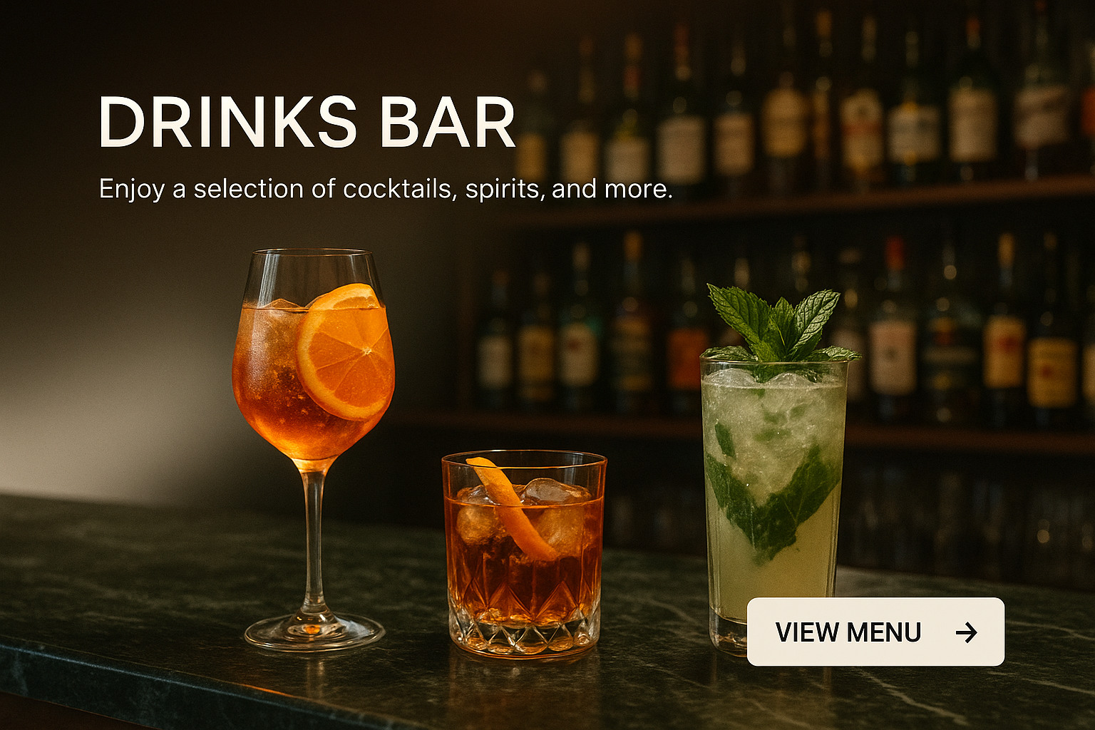 An inviting drinks bar scene featuring colorful cocktails. The layout includes a label, a catchy title, and a button to view the menu, all designed for clarity and style.