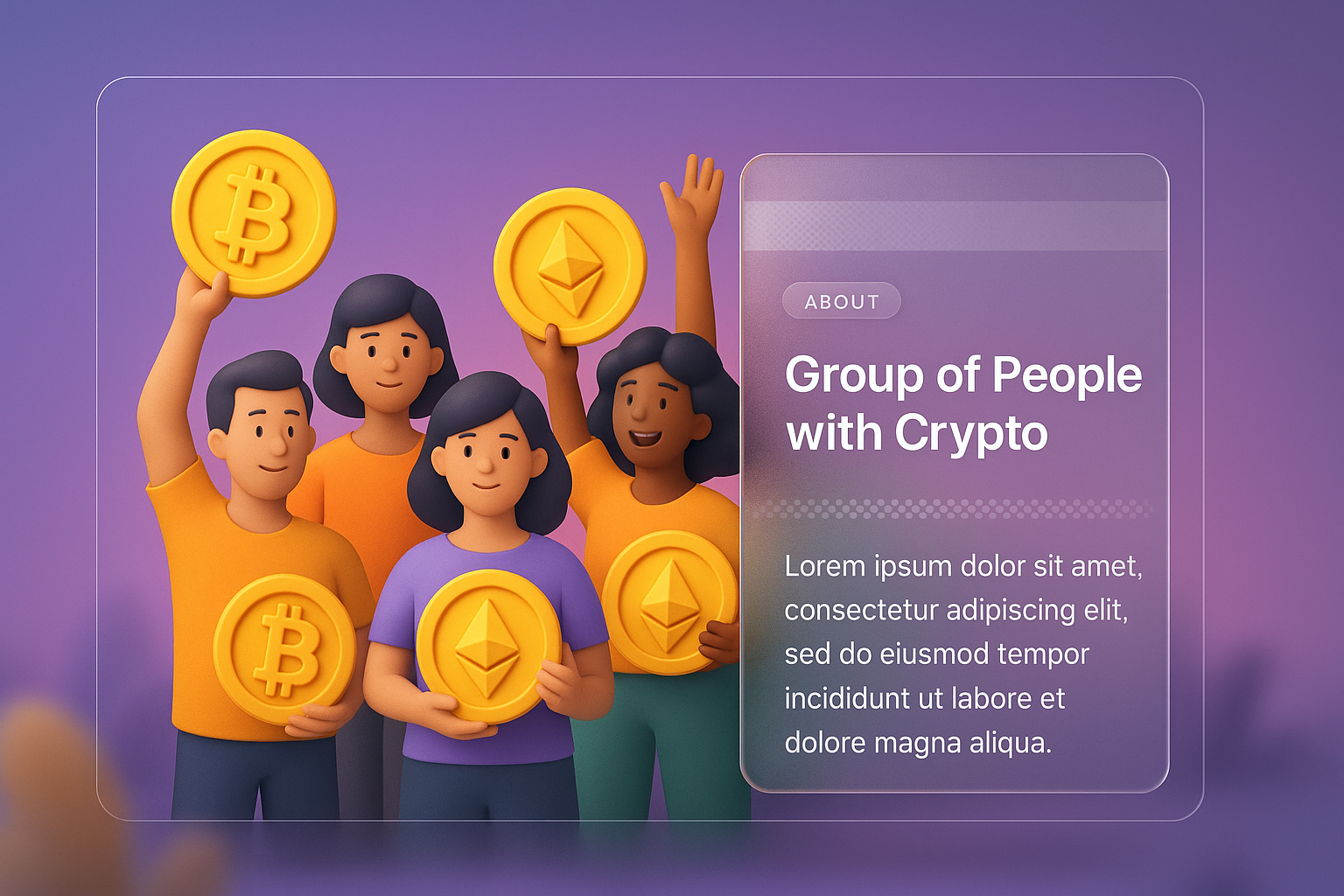 /Collection: /by davooda/Type: PNG/A vibrant 3D illustration featuring a diverse group of people joyfully holding cryptocurrency coins, set against a smooth gradient background. The design integrates text blocks and a transparent glass effect.