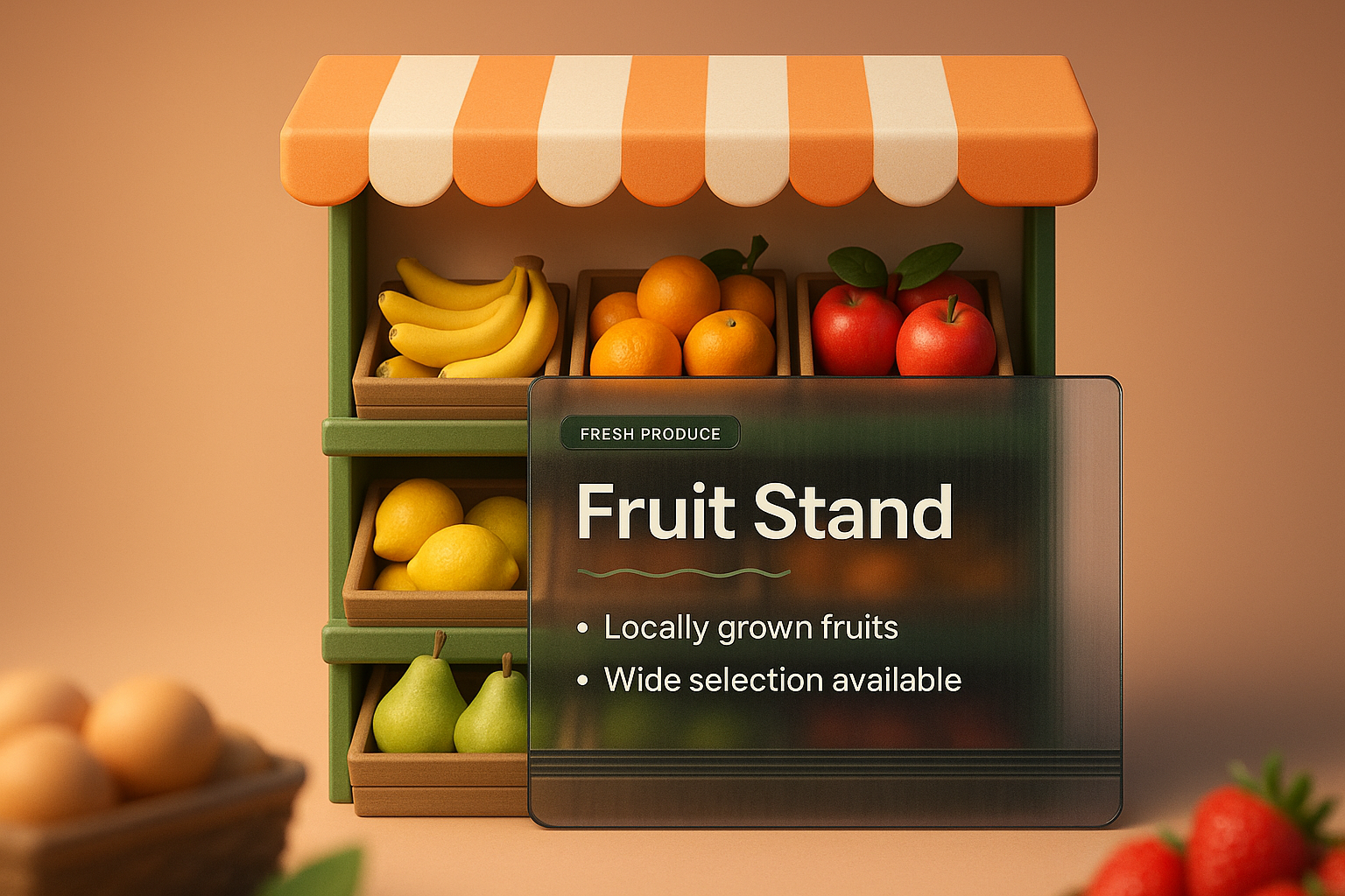 A vibrant 3D fruit stand showcasing an assortment of fresh fruits, including bananas, apples, and pears. The design features a charming striped awning and a transparent label with promotional text.