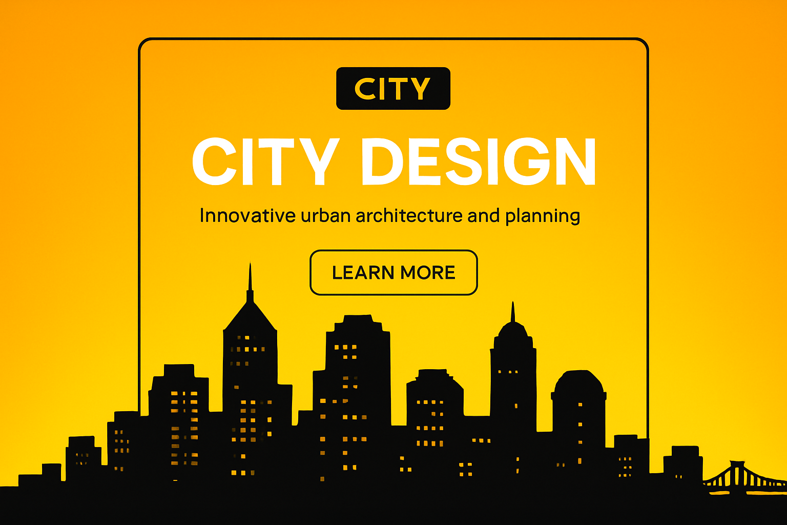 This is a promotional banner showcasing city design concepts with a vibrant gradient background. It targets urban planners and architects.