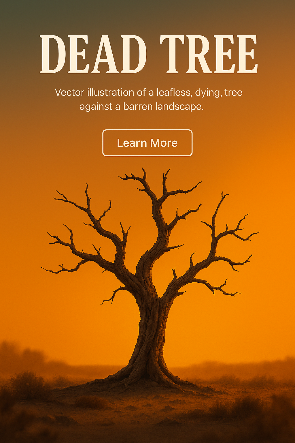 /Collection: /by davooda/Type: PNG/This image is a vector illustration featuring a leafless, dying tree set against a barren landscape with an orange hue. It serves as a striking visual for themes of desolation or nature's resilience.