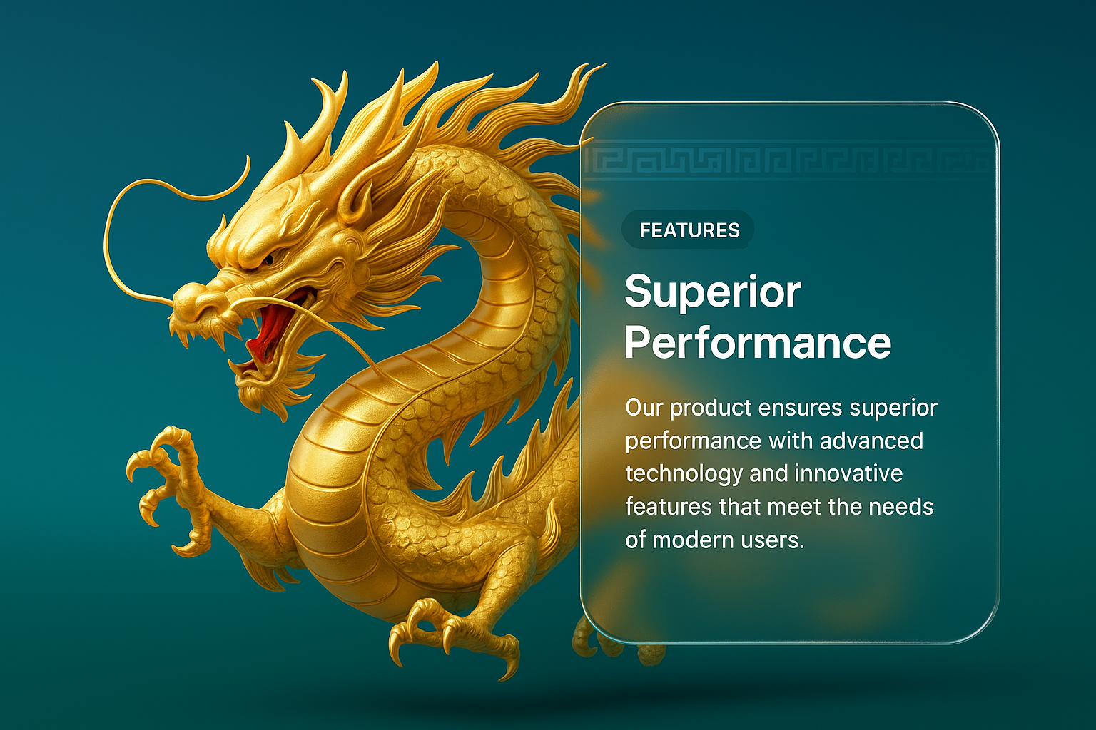 /Collection: /by davooda/Type: PNG/A beautifully rendered 3D illustration of a golden Chinese dragon, showcasing intricate details. The dragon is depicted against a gradient background, accompanied by a feature block highlighting superior performance.