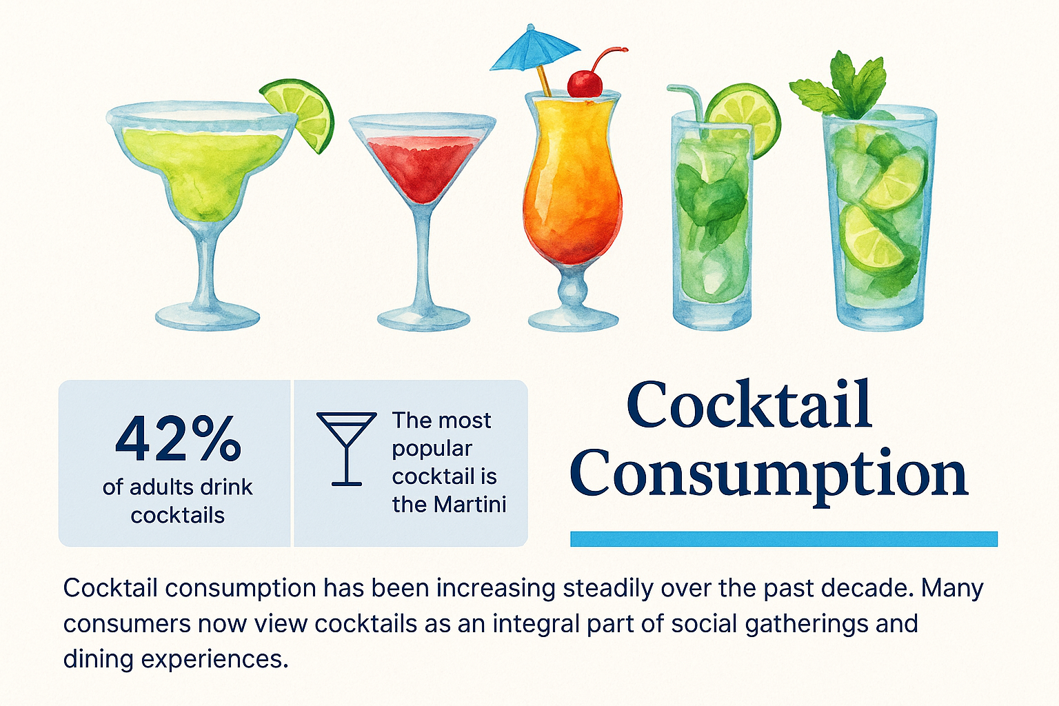 /Collection: /by davooda/Type: PNG/Informative infographic showcasing different cocktails with statistics on adult drink consumption, emphasizing social gathering trends. Perfect for beverage marketing.