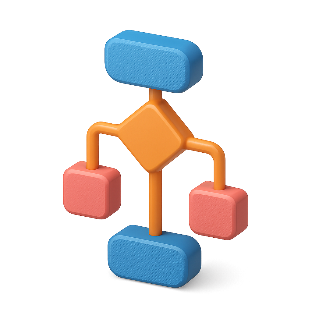 /Collection: /by davooda/Type: PNG/A visually striking 3D flowchart diagram featuring colorful geometric shapes. The design includes decision points and connections, all rendered in a three-quarter isometric perspective with a soft glow effect.