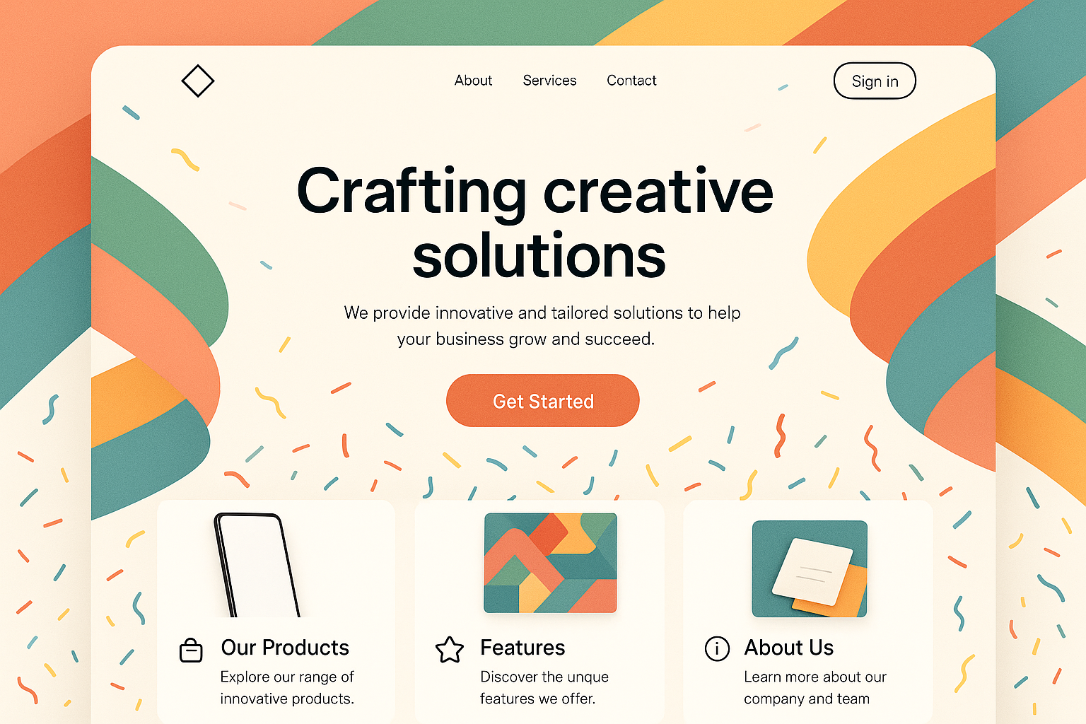 /Collection: /by davooda/Type: PNG/A visually appealing landing page layout featuring colorful abstract elements, a sign-in button, and sections for products and features. Designed for user engagement.