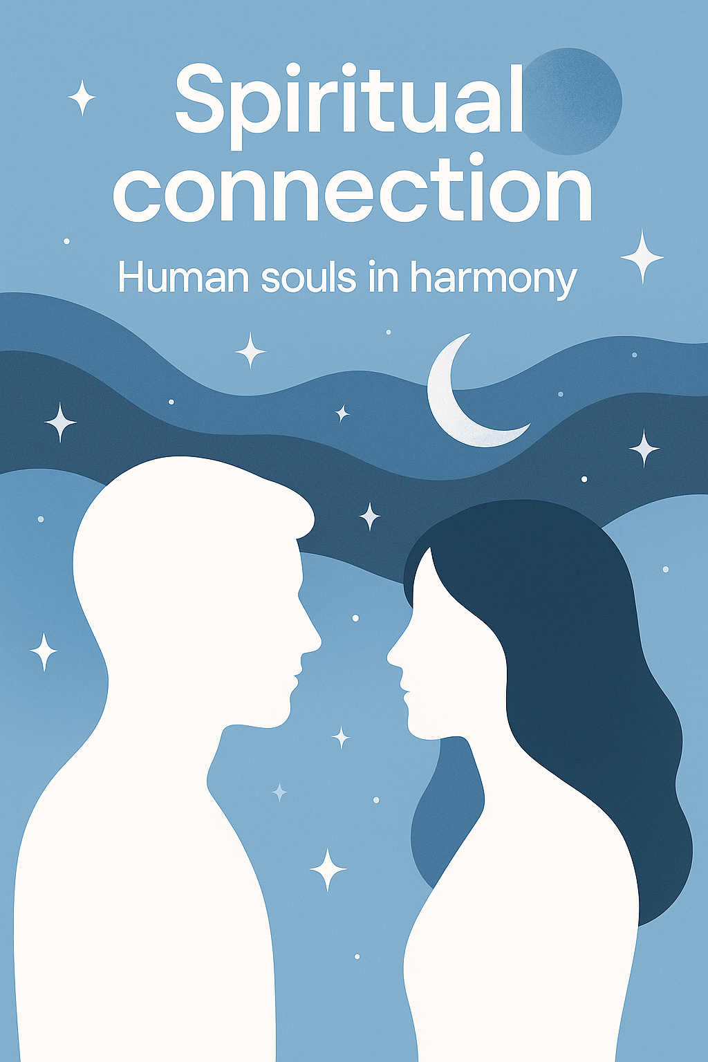 /Collection: /by davooda/Type: PNG/A visually striking illustration depicting two human silhouettes representing spiritual connection, set against a serene blue background with celestial elements. Ideal for wellness and personal growth themes.