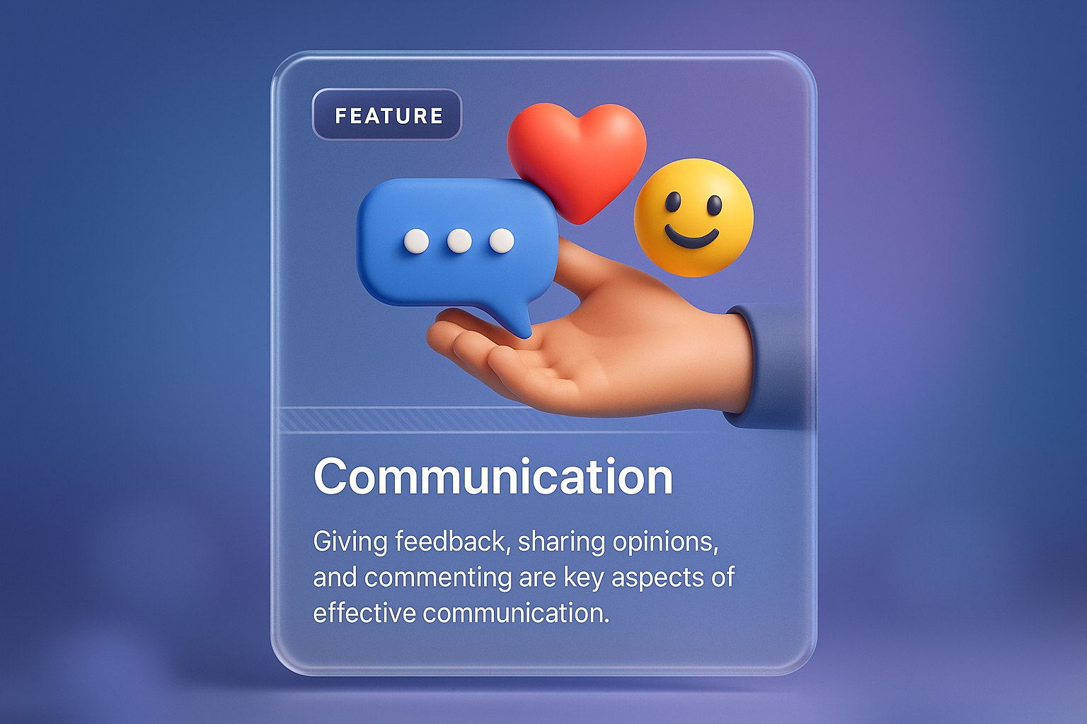 A 3D illustration featuring a hand holding a speech bubble, heart, and smiley emoji, representing communication. The design emphasizes feedback and sharing opinions with a smooth gradient background.