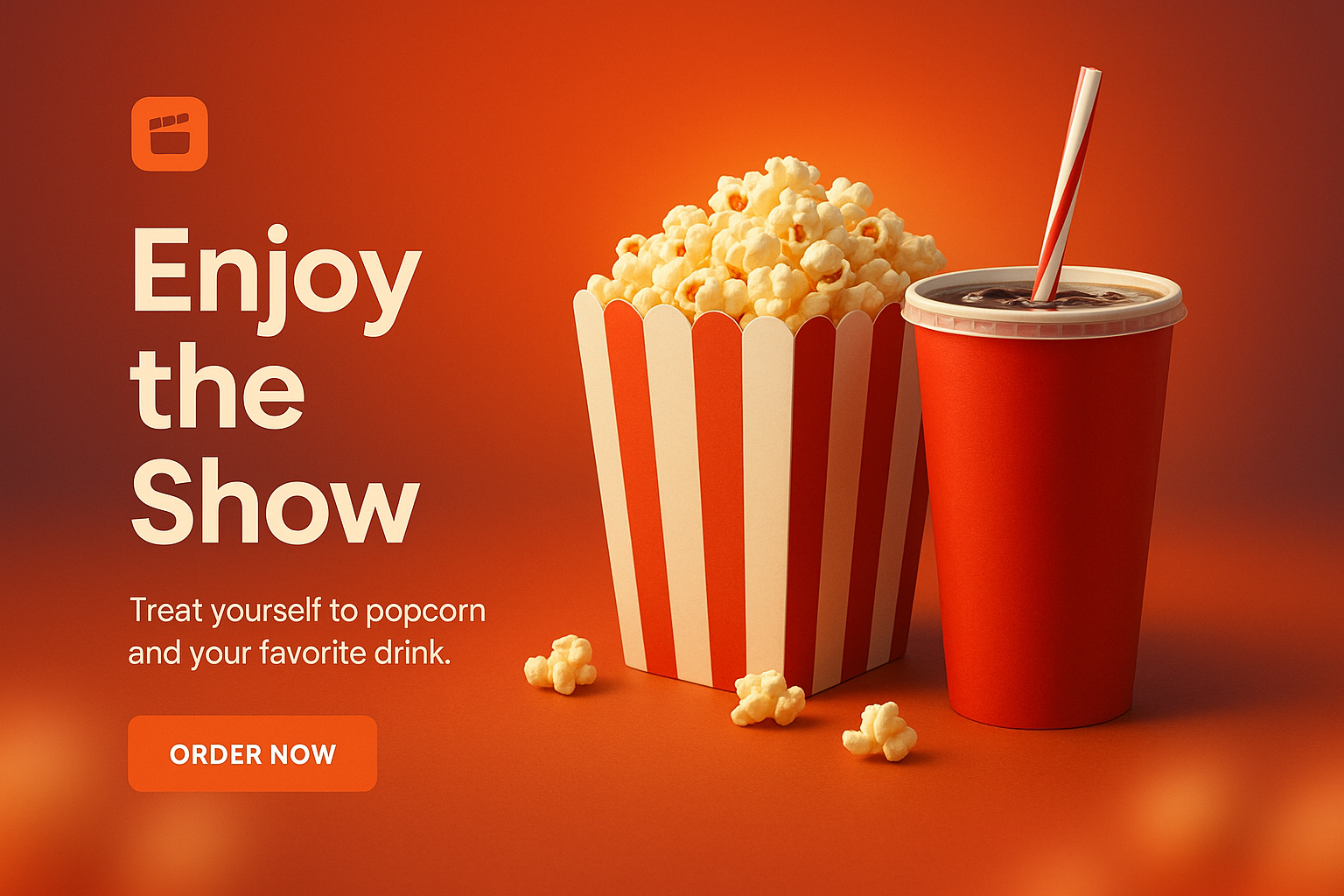 /Collection: /by davooda/Type: PNG/This vibrant promotional graphic showcases a popcorn bucket and a drink, designed for a movie theater audience. The warm colors evoke a cozy atmosphere, ideal for enticing customers.
