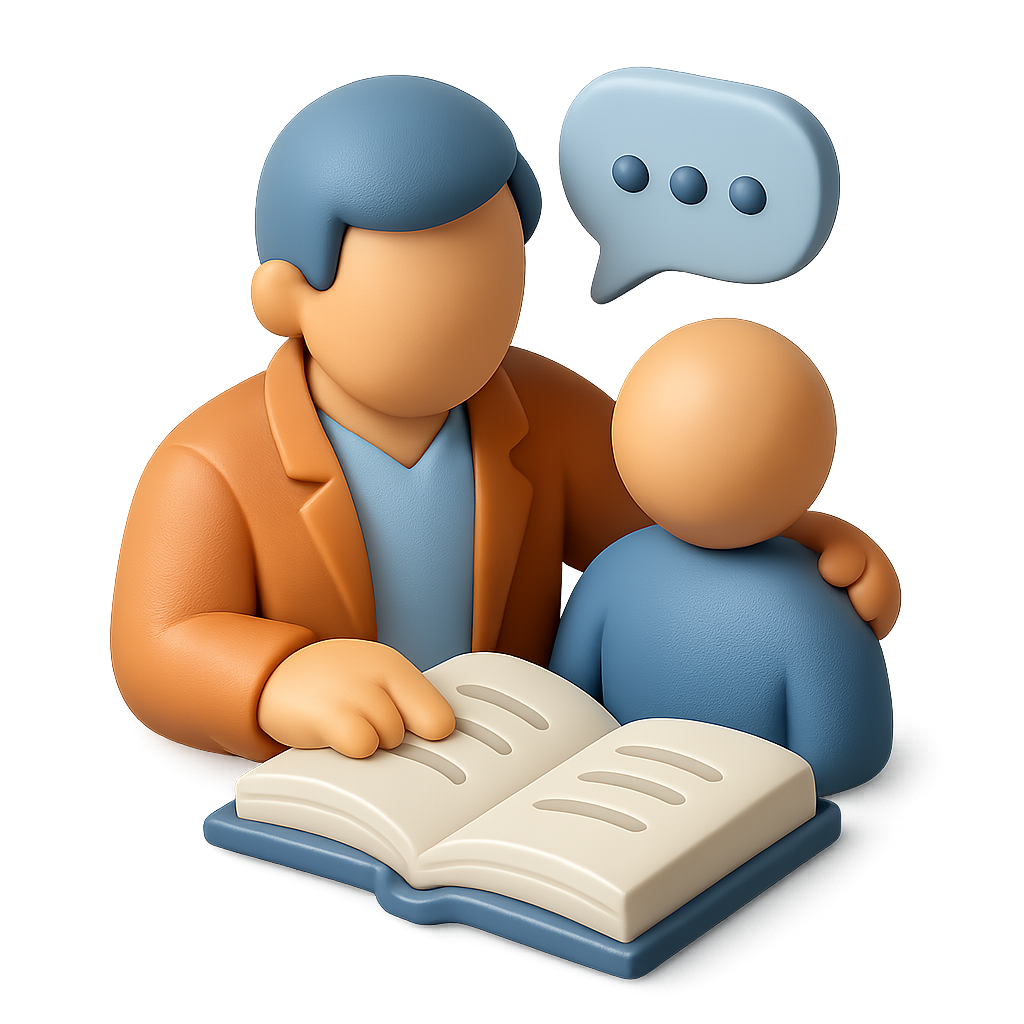 A stylized 3D icon depicting a mentor figure with a book and a speech bubble, showcasing a three-quarter view. The warm colors and volumetric design enhance the mentorship theme.