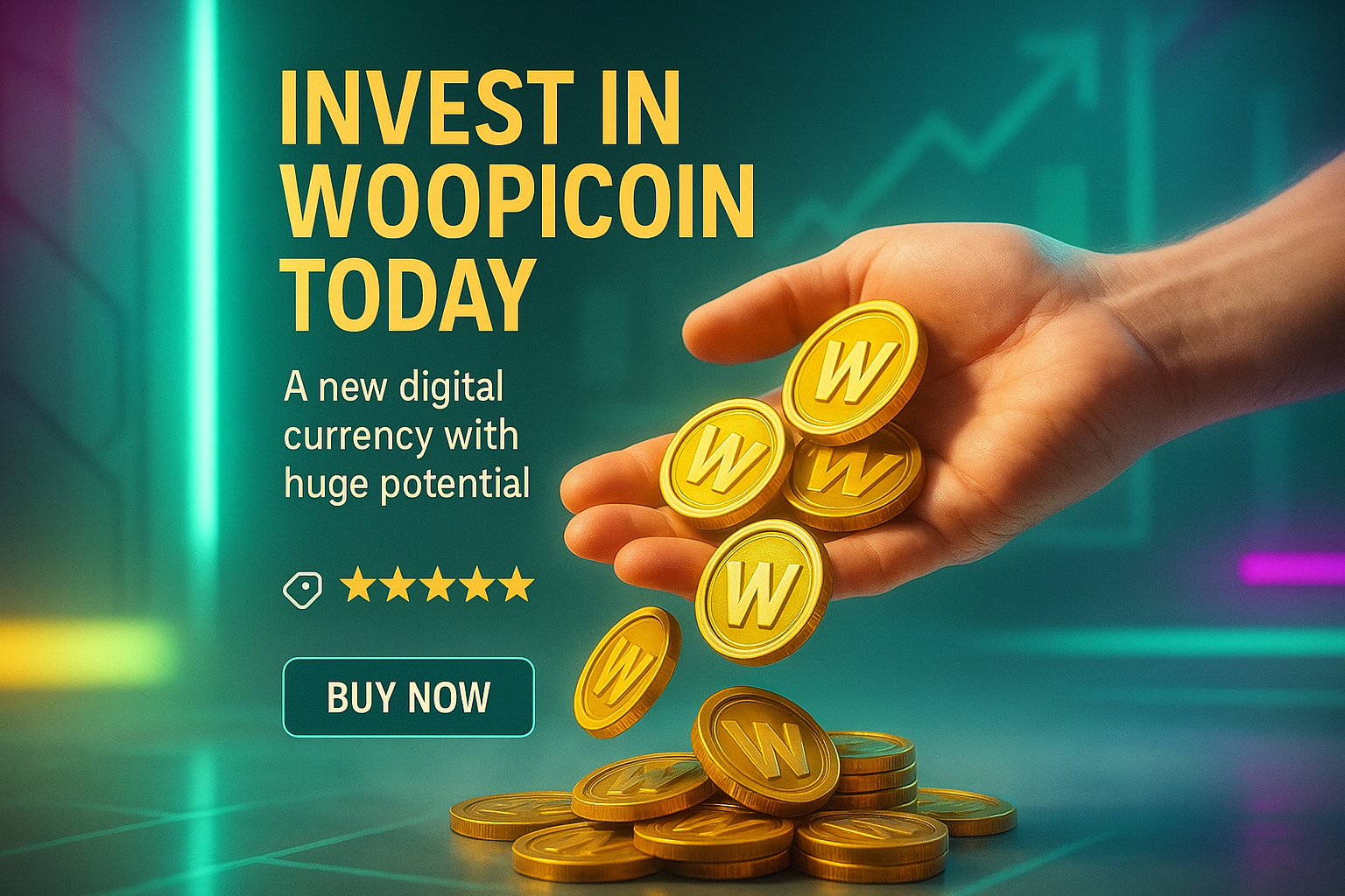/Collection: /by davooda/Type: PNG/Vibrant promotional banner highlighting the investment opportunity in Woopcoin, featuring a hand holding coins against a futuristic background, ideal for digital finance marketing.