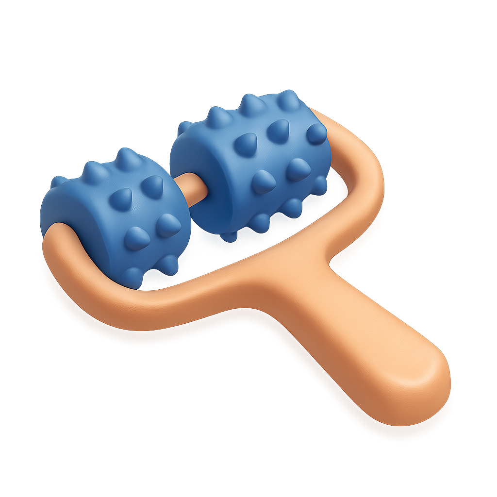 A sleek, isometric representation of a massage roller tool featuring blue spiked rollers and a smooth orange handle, set against a soft gradient background.