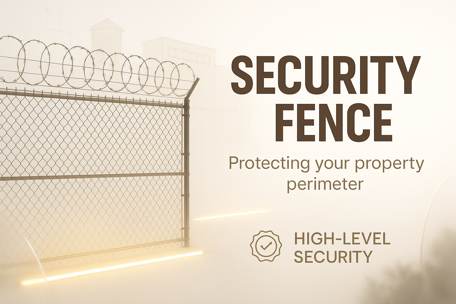 Modern promotional graphic highlighting security fencing solutions, featuring a minimalist design and a focus on property protection, suitable for security service marketing.