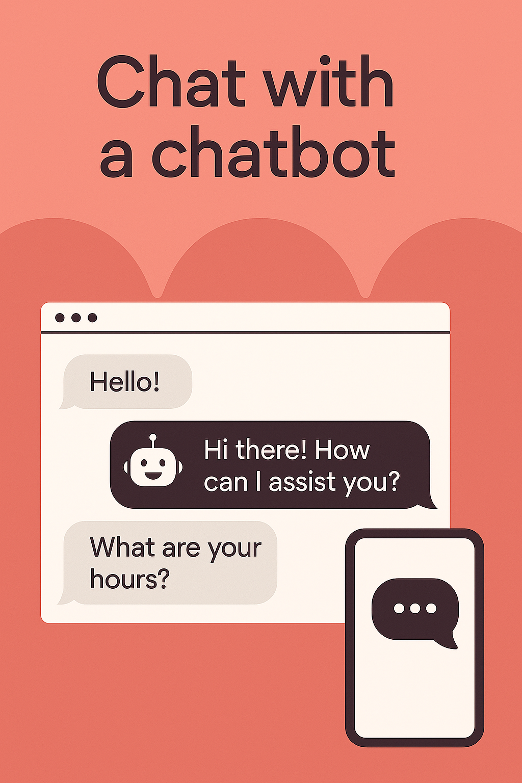 A modern graphic illustrating a chatbot interaction, featuring a conversation window and mobile device. Ideal for website or app user engagement materials.