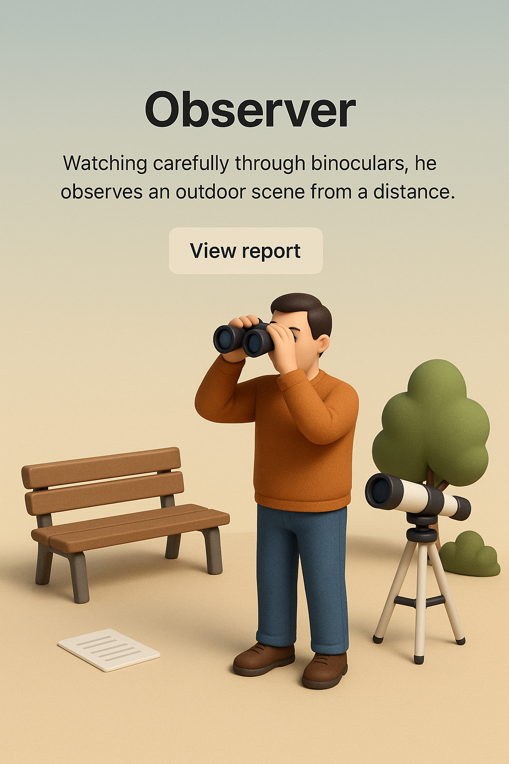 /Collection: /by davooda/Type: PNG/A detailed 3D illustration of an observer using binoculars to watch an outdoor scene from a distance. The setting includes a bench, a tree, and a report on the ground.