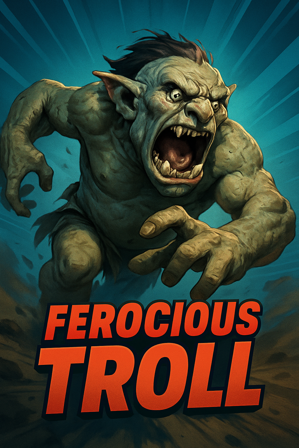 /Collection: /by davooda/Type: PNG/A powerful depiction of a ferocious troll mid-action, highlighting its muscular build and fierce expression. The dynamic background features rays emanating from the center, enhancing the sense of movement.
