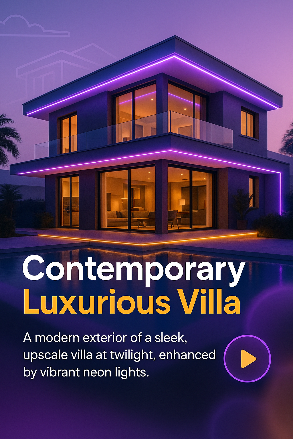 Stunning exterior shot of a contemporary villa at twilight, featuring vibrant neon lighting. Ideal for real estate marketing or luxury living showcases.