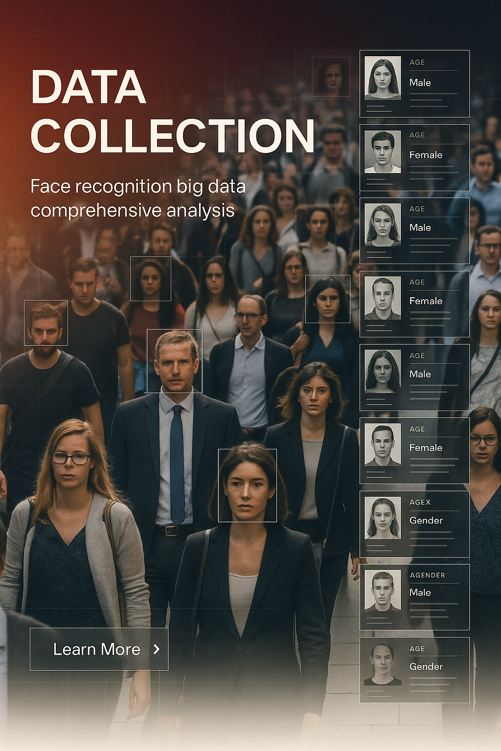 /Collection: /by davooda/Type: PNG/An interface showcasing face recognition technology in a busy crowd. Various profiles with age and gender information are displayed alongside individuals walking in a city.