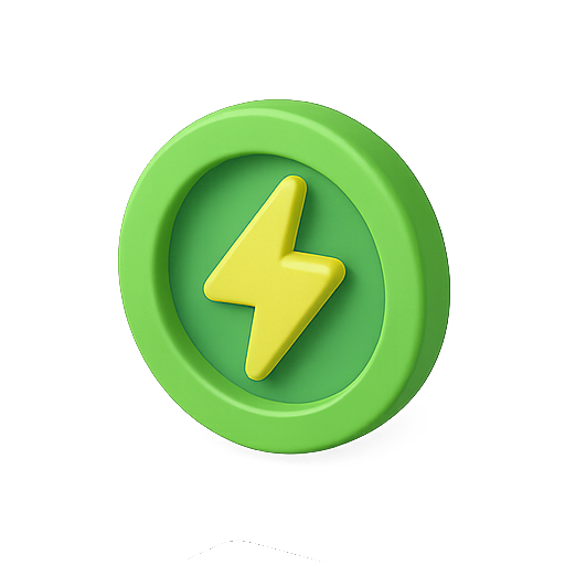 A vibrant 3D icon featuring a lightning bolt within a circular green badge, ideal for representing energy or power concepts in digital applications.