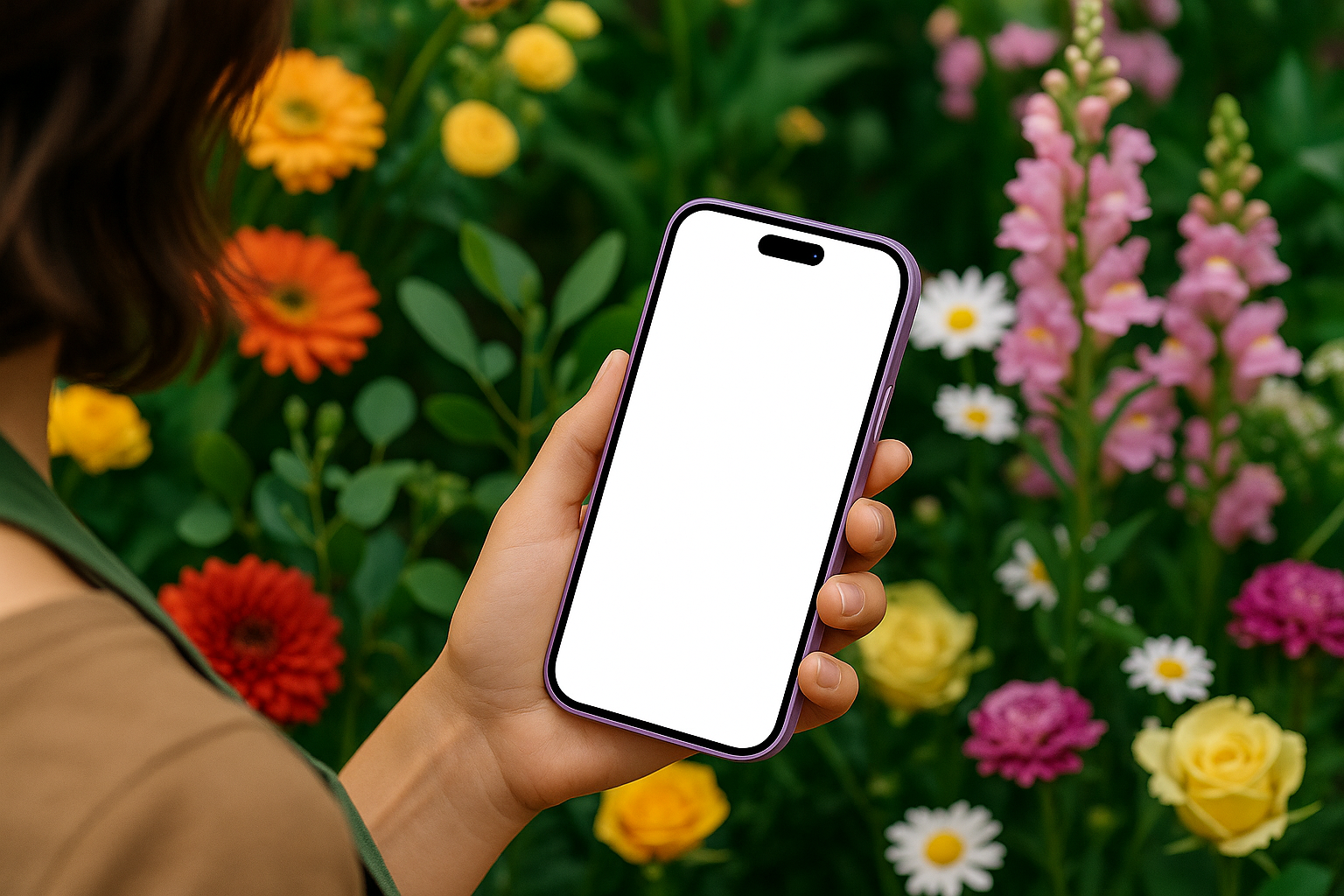 /Collection: /by davooda/Type: PNG/A florist stands among vibrant flowers, holding a purple phone with a white screen. The image captures a dynamic angle from behind the florist, focusing on the phone and floral backdrop.