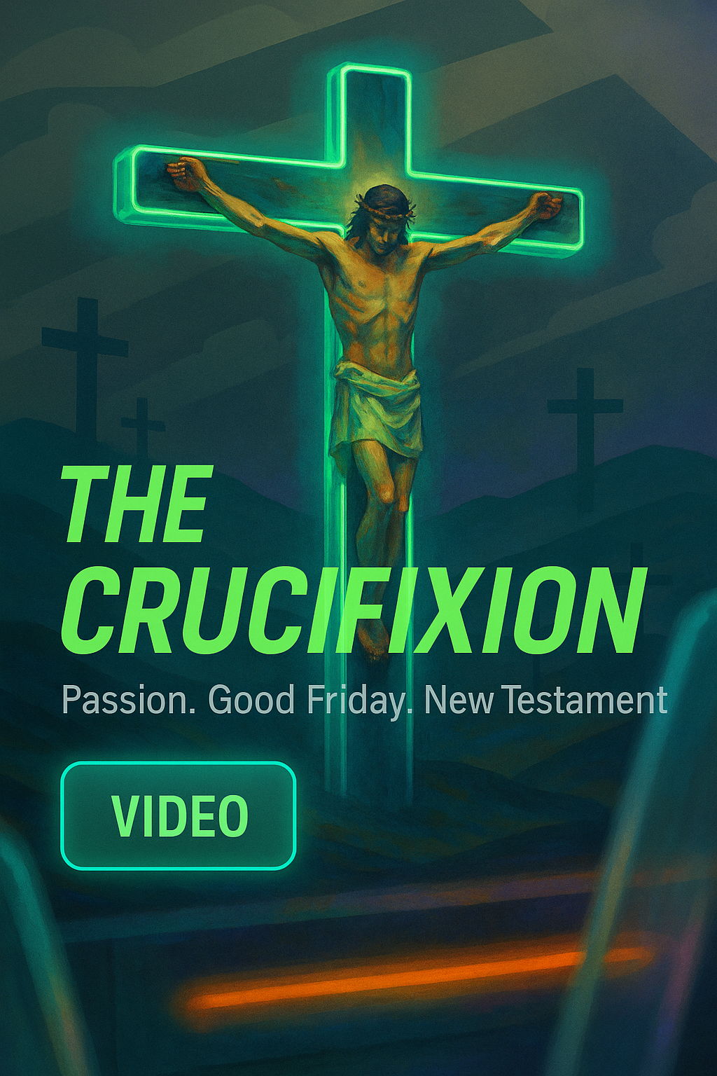 Vibrant video graphic depicting the crucifixion with neon elements, designed for religious content. Ideal for Easter or Good Friday themes.