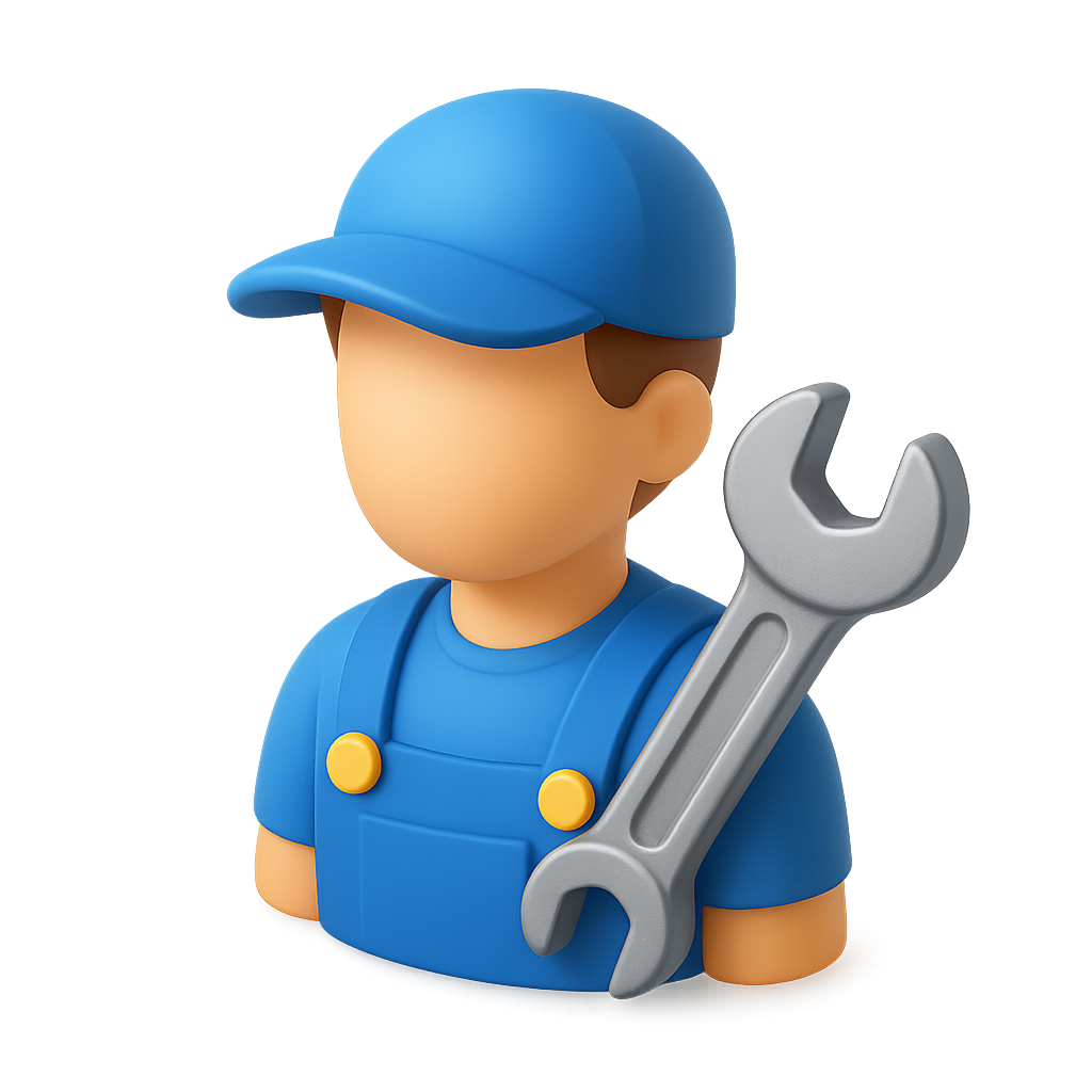A vibrant 3D icon of an auto mechanic wearing a blue cap and overalls, holding a wrench. The design has a transparent background and features a volumetric, isometric perspective.