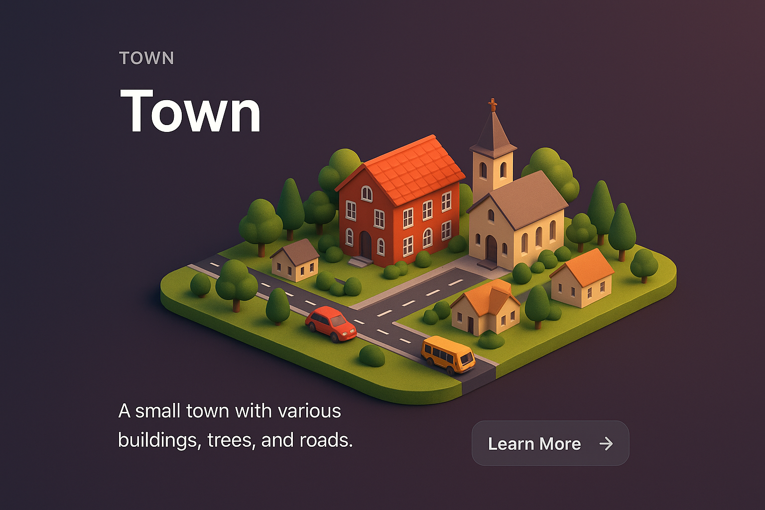 A visually appealing 3D representation of a small town, featuring buildings, trees, and roads in a zoomed-out perspective, set against a dark gradient background.