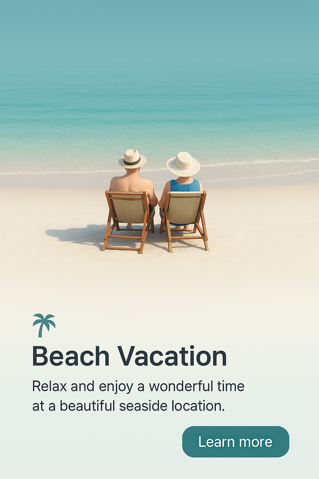 /Collection: /by davooda/Type: PNG/An elderly couple sits on sun loungers on a pristine, empty beach. The serene ocean and soft sandy shore create a tranquil vacation atmosphere, emphasizing relaxation.