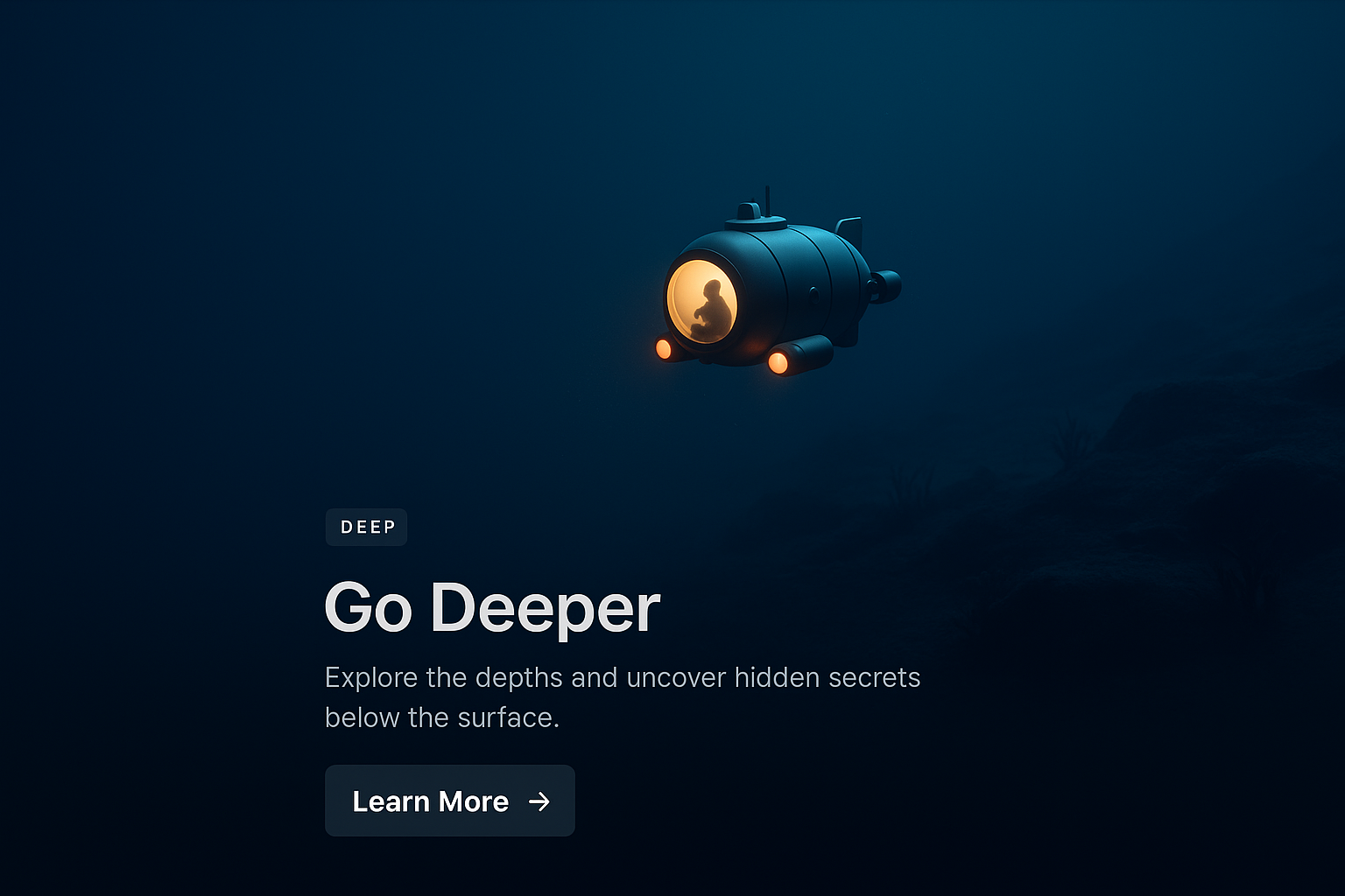 A stunning 3D scene showcasing a submarine exploring underwater depths. The dark gradient background enhances the mysterious atmosphere, with a clear call to action button.