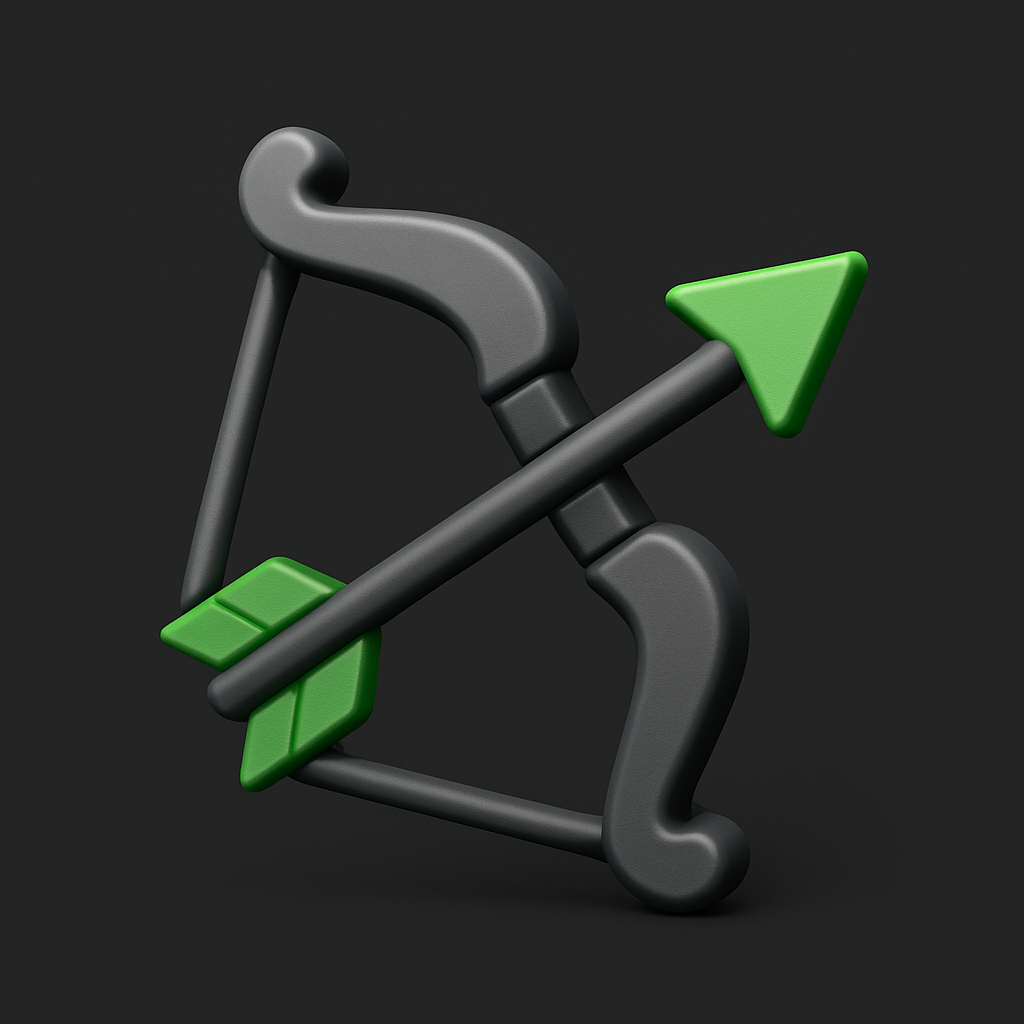A detailed 3D icon of a bow with arrows, designed in black, gray, and green colors. The icon is set against a dark gray background, showcasing a modern gaming aesthetic.