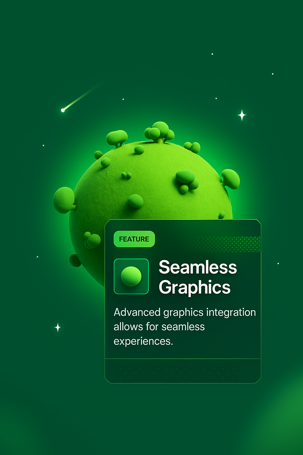 /Collection: /by davooda/Type: PNG/A vibrant 3D illustration of a small green planet surrounded by soft details and a seamless graphics feature block. The scene is set against a smooth gradient background, enhancing its depth.