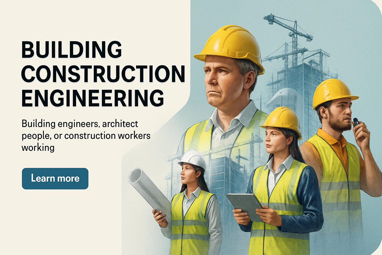 /Collection: /by davooda/Type: PNG/A digital illustration of construction engineers and architects in a modern setting. The design features bold typography and a well-composed layout with geometric background elements.