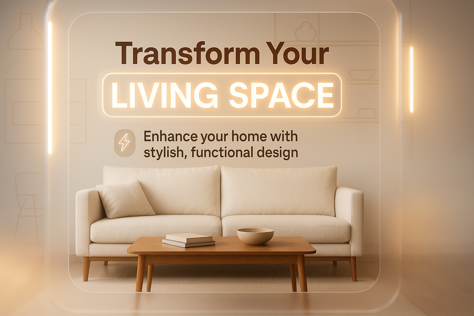 /Collection: /by davooda/Type: PNG/Stylish promotional graphic showcasing a modern living room with a focus on transforming home interiors. Ideal for home decor marketing and design inspiration.