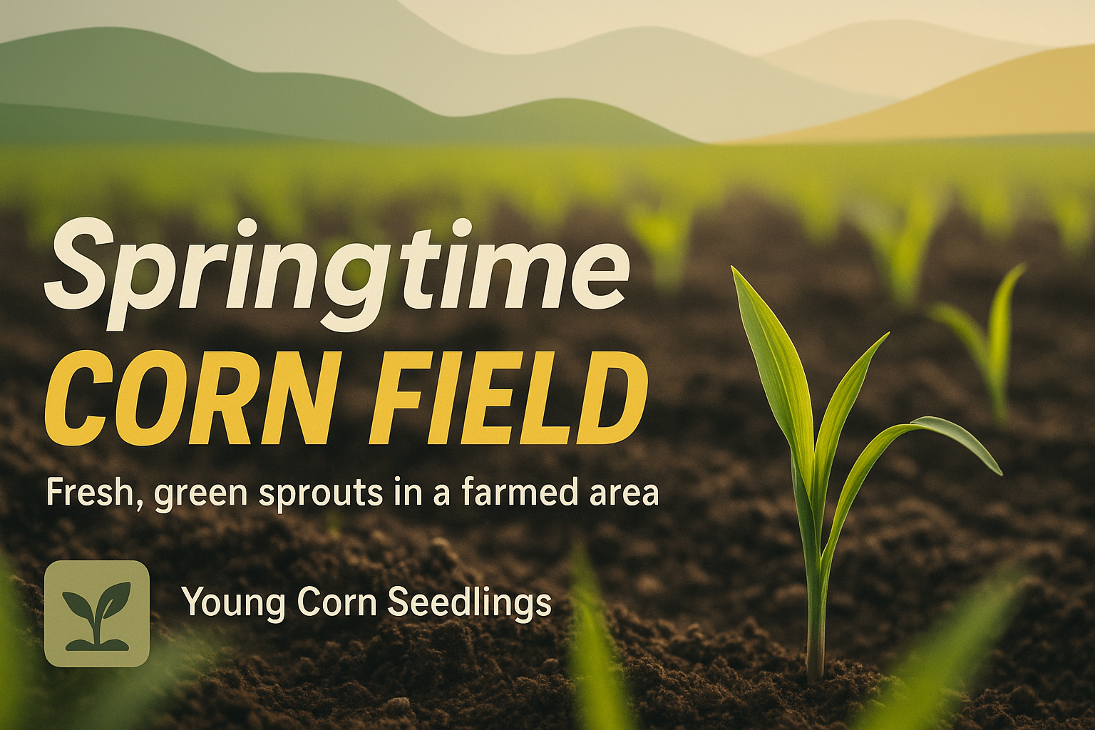 Serene agricultural landscape showcasing young corn seedlings in a tilled field during spring, perfect for farm-related content or agricultural promotions.
