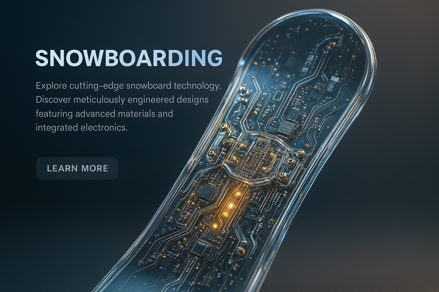 /Collection: /by davooda/Type: PNG/This image showcases a hyperrealistic snowboard, crafted from glass-like materials. The internal components glow with micro-LEDs and intricate circuit designs, reflecting ambient light beautifully.