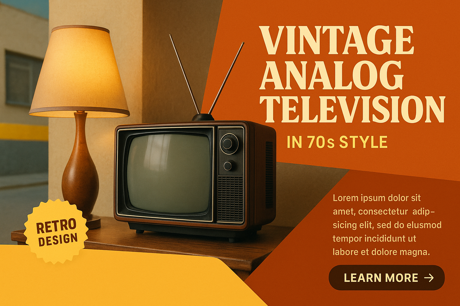 /Collection: /by davooda/Type: PNG/A vintage analog television set alongside a stylish lamp, set against a warm color background reminiscent of the 1970s. The design features bold typography and a retro aesthetic.