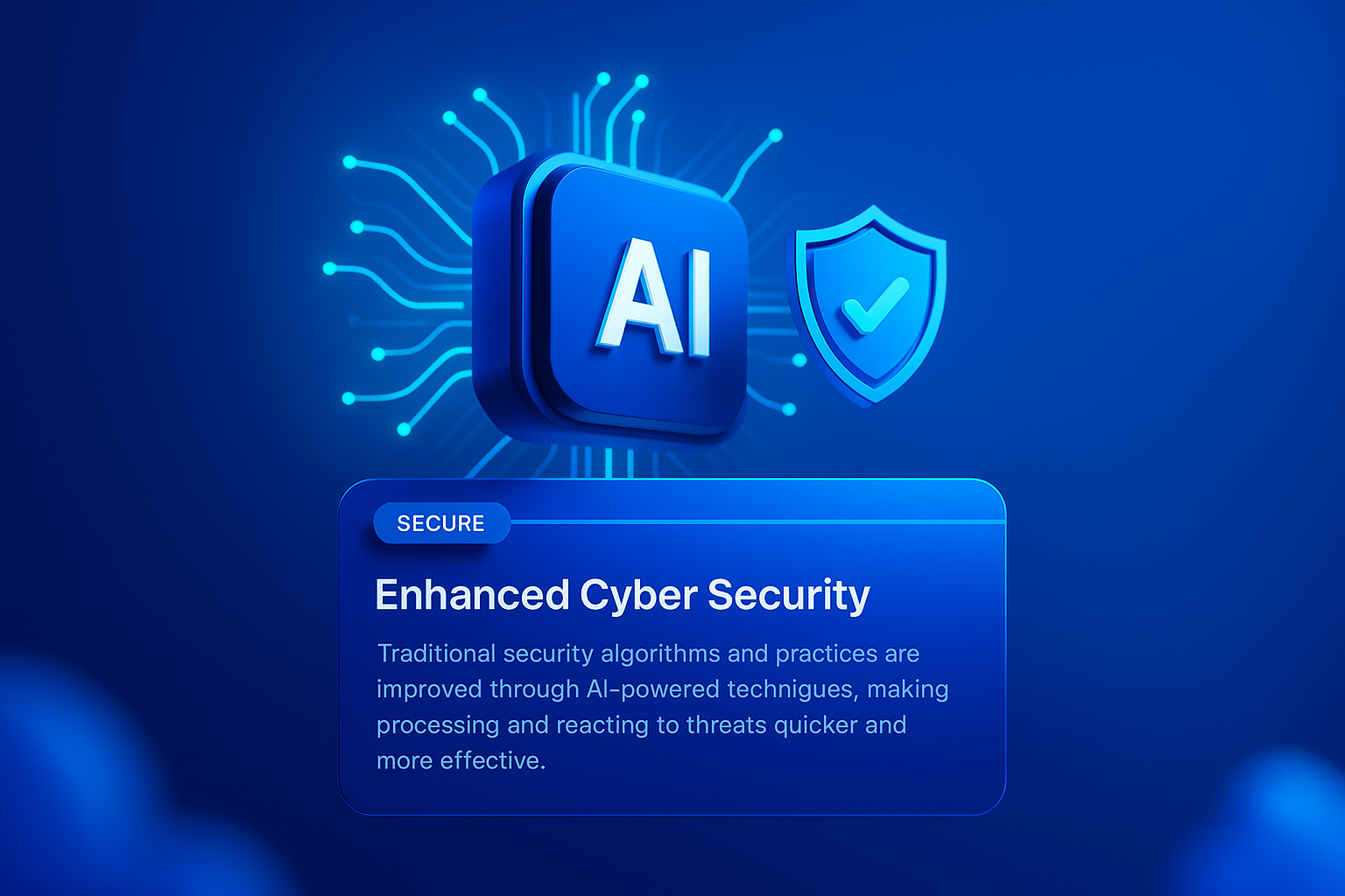 A visually striking 3D illustration depicting cyber security concepts with an AI element. The background features a smooth blue gradient, enhancing the futuristic theme.