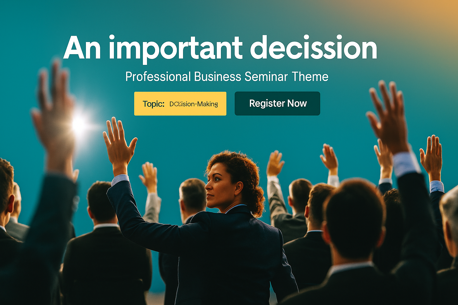 /Collection: /by davooda/Type: PNG/This image represents a professional seminar theme focused on decision-making, featuring an audience with raised hands. It is designed for promotional use in business contexts.