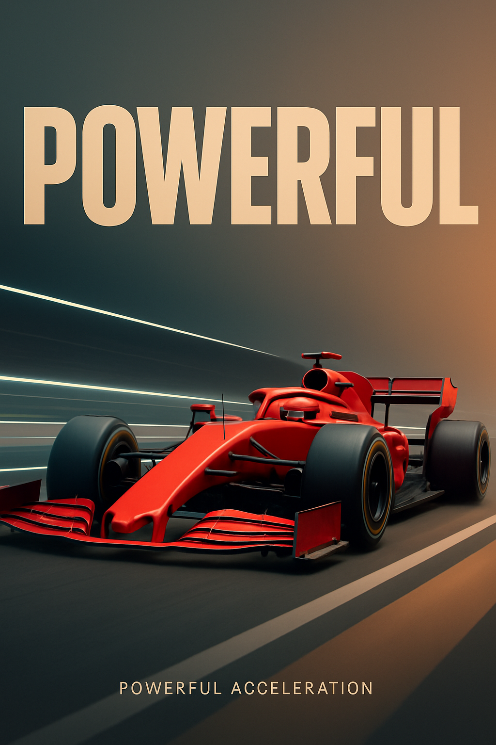 A hyper-realistic red Formula One car accelerates on a night track, enhanced by motion blur and light strips. The composition features bold typography and a modern, stylish layout.