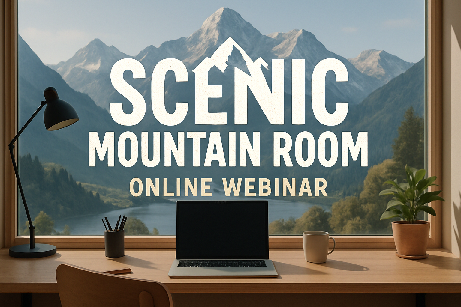 /Collection: /by davooda/Type: PNG/Promotional image for an online webinar featuring a scenic mountain view from a cozy workspace. The design emphasizes nature and tranquility, suitable for attracting participants looking for a calming environment.