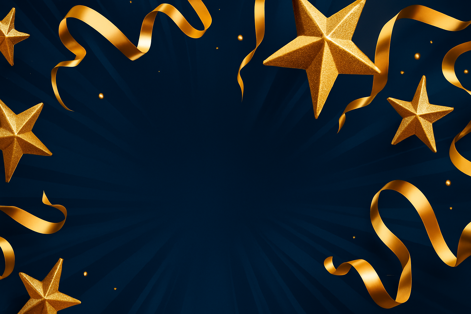 /Collection: /by davooda/Type: PNG/A vibrant Christmas and New Year themed background featuring golden stars and gilded ribbons set against a navy blue backdrop. The design includes dynamic elements and ample space for text.