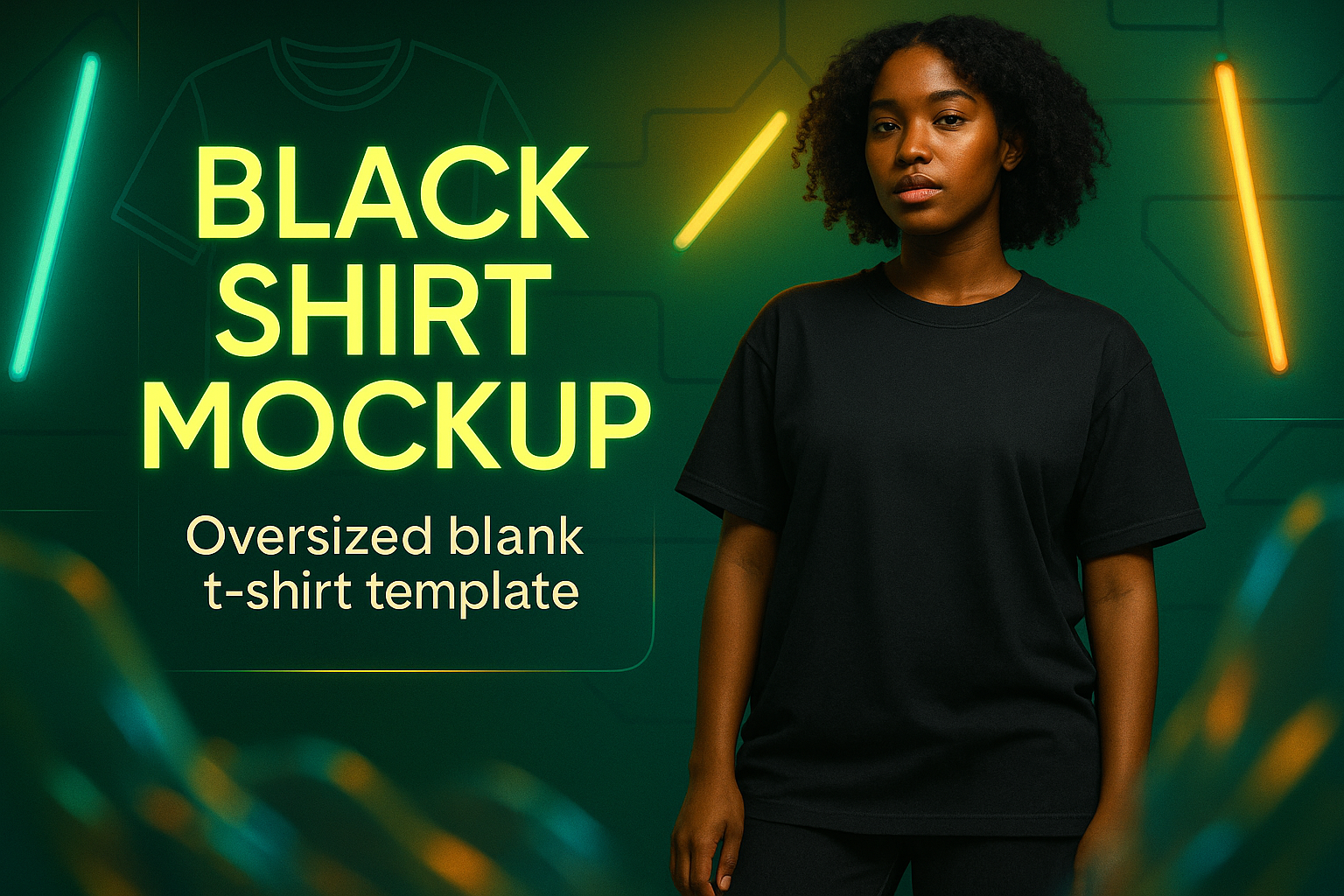 Stylish mockup featuring a model wearing a black oversized t-shirt against a vibrant background, ideal for fashion branding and apparel marketing.