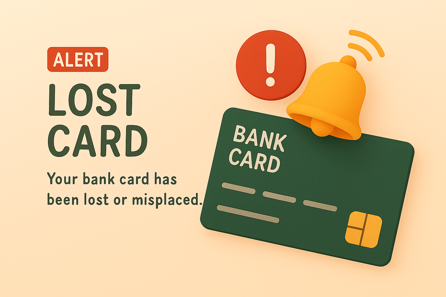 A digital illustration featuring a 3D bank card with an alert bell, designed to convey a notification about a lost card. Ideal for banking apps or financial services.