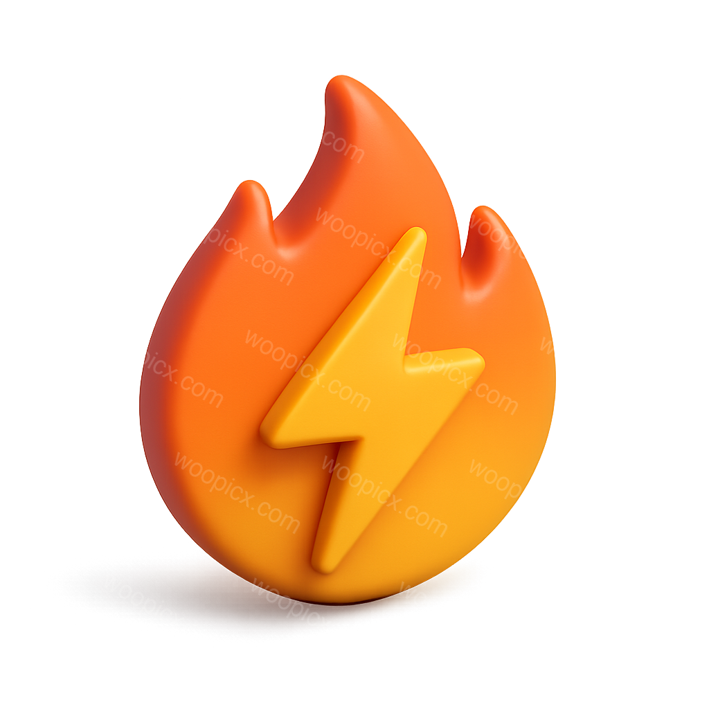 /Premium/Collection: /by davooda/Type: PNG/A vibrant 3D icon featuring a flame shape with a lightning bolt integrated into it. The design showcases a smooth, glossy finish with a gradient of orange and yellow hues, set against a transparent background.