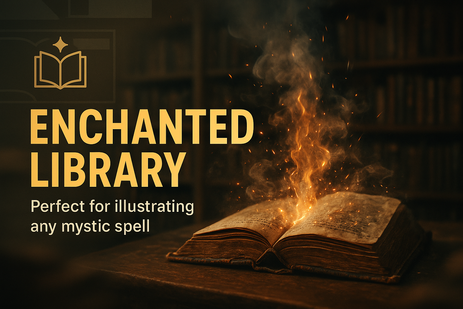 A captivating image featuring an open book emitting magical sparks, set in a mystical library. Ideal for fantasy-related projects, storytelling, or spell illustrations.